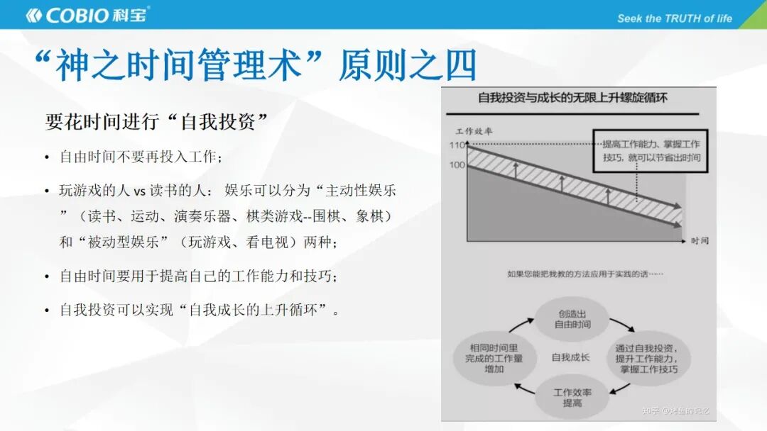 4.要花时间进行自我投资——很多人把自己通过学习时间管理术创造出来的“自由时间”又用于工作,在作者看来,这是最差劲的时间管理方法。他认为自由时间不要再投入工作,而应该用来做“自我投资”。通过学习、主动性娱乐,来提高自己能力和技巧,为自己日后的工作打下基础。他把娱乐分为“主动性娱乐”(读书、运动、演奏乐器、棋类游戏--围棋、象棋)和“被动型娱乐”(玩游戏、看电视)两种。通过自我投资获得自我成长,创造出自由时间再用于自我投资,就进入了一个“自我成长的上升循环”。
