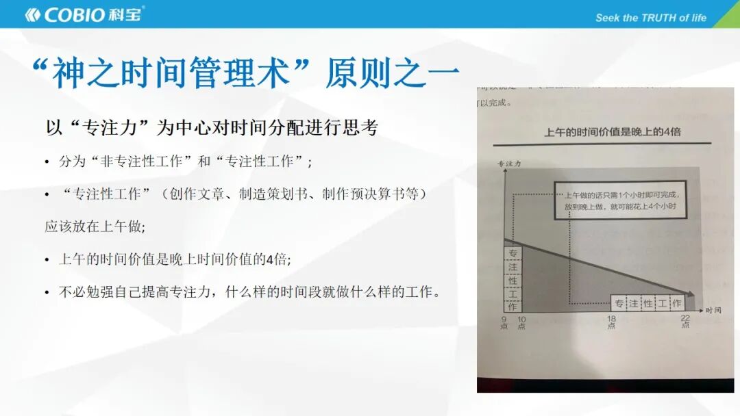 1. 以“专注力”为中心对时间分配进行思考——作者提及我们的日常工作可以分为“非专注性工作”(譬如查看电子邮件、打电话、接待客户、复印等) 和“专注性工作”(譬如创作文章、制作策划书、阅读英语)两种。其中“专注性工作”,即那些需要大块时间段需要高度专注的工作,应该放在上午做,因为上午的时间价值是晚上时间价值的4倍之多。总而言之,我们要学会灵活运用大脑的黄金时间,在合适的时间做合适的事情,这样即能提高效率,也不必勉强自己在专注力低下时痛苦地耗时间。