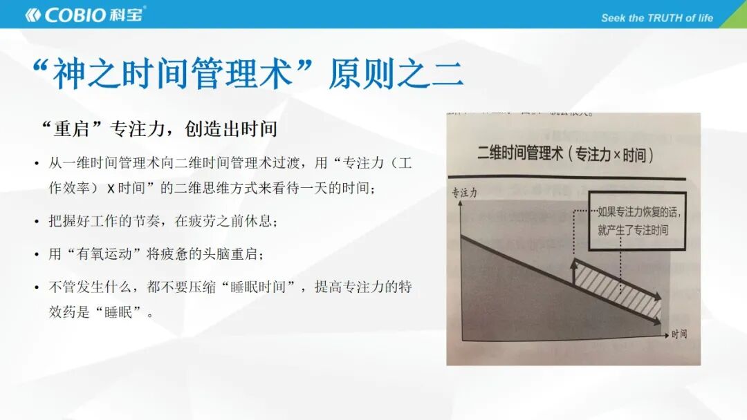 2. 重启“专注力”,创造出时间——与大多数人用线性思维看待时间不同,作者认为要用“专注力(工作效率) X 时间”的二维思维方式来看待一天的时间。在专注力高的时间段做需要高度专注力的工作,工作量的‘面积’就会很大,时间的流动是“面”而非“线”。其次要把握好工作的节奏,在疲劳之前休息, 并用“有氧运动”将疲惫的头脑重启。另外不管发生什么,都不要压缩“睡眠时间”。每天保证充足的睡眠,再进行适度的有氧运动,仅仅是这样小小的改变,就能提高或恢复我们的专注力,创造出“专注时间”,也就相当于创造出了额外的新时间。