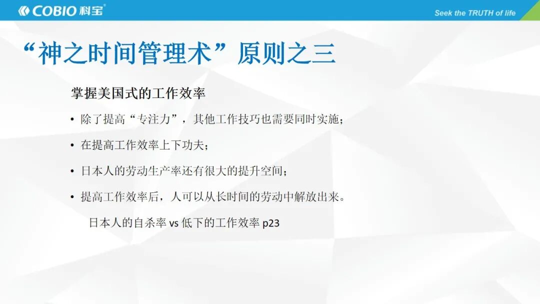3.掌握美国式工作效率——大家都认为日本人很勤劳,下了班还留在公司辛苦加班的人不在少数。但作者却认为这是因为日本人的工作效率很低。因为工作效率低,为了创造出较高的价值,日本人必须延长工作时间,于是,便形成了过于严苛的劳动环境。作者还认为日本人的劳动生产率低下和自杀率高,它们之间存在内在的联系。作者曾在美国留学3年,他观察到美国人基本准时下班,这和他们的高效工作术有关。