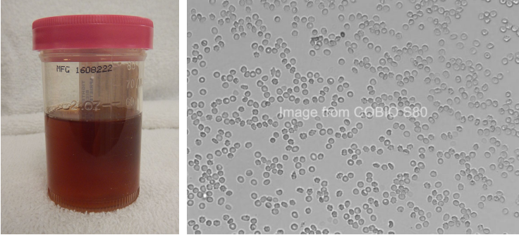 注意:血尿不一定含有血细胞,也可能是血细胞破裂后的血红蛋白或肌细胞破裂肌红蛋白染红造成的,后两种情况更危险,因此一定要在镜下仔细寻找血细胞并查清血尿的来源。